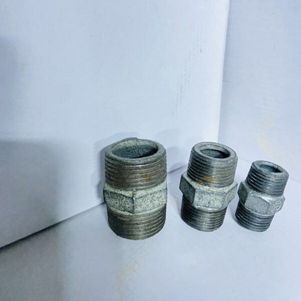 A galvanized iron fitting with threaded ends, used to connect two fittings or extend pipe length.